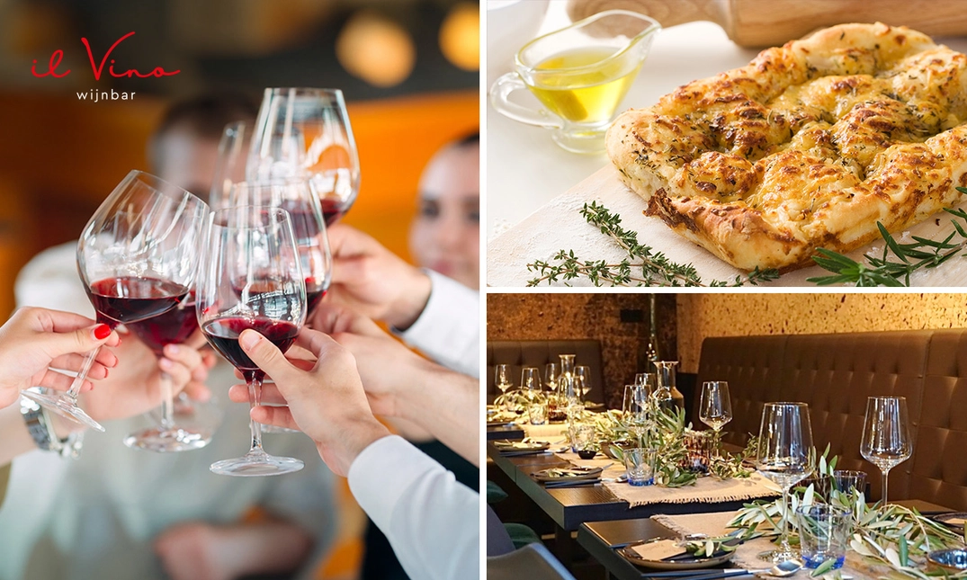 Geniet van een heerlijk borrelmoment met 2 glazen wijn en focacciabrood met olijfolie bij Il Vino Wijnbar: proost met jouw favoriete gezelschap en geniet van exclusieve wijnen