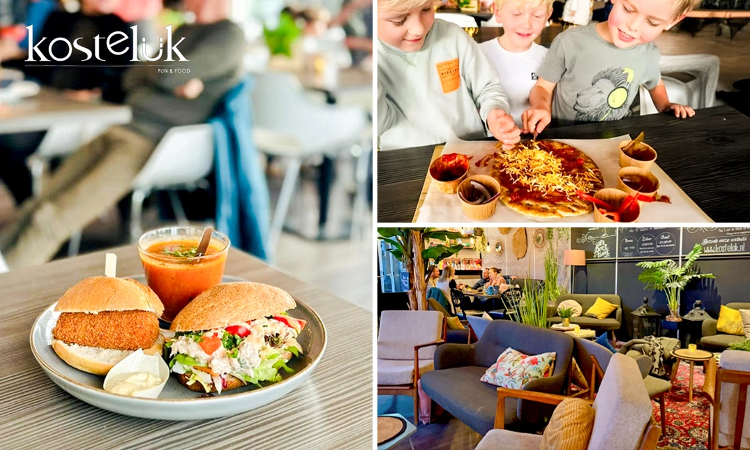 Geniet met het hele gezin van een heerlijke lunch bij Kosteluk in Egmond aan Den Hoef. Smul bijvoorbeeld van een soepje, broodje kroket en belegd broodje. Neem ook de kinderen gezellig mee! Zij maken hun eigen pizza met verschillende toppings. Die gaat de oven in en wordt tegelijkertijd geserveerd met het 12-uurtje. Daarnaast genieten ze van een potje airhockey, beker limonade en bolletje schepijs. Een heerlijk uitje met het hele gezin!