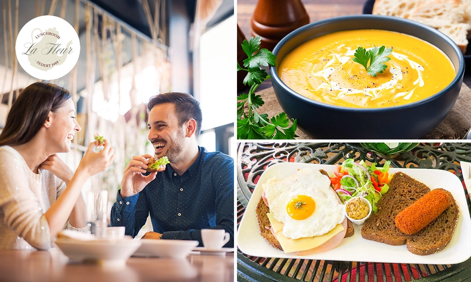 Geniet van een heerlijk 2-gangenlunch bij Lunchroom La Fleur in het centrum van Doesburg: met Doesburgse mosterdsoep, boterham met ham en/of kaas en ei én een boterham met kroket