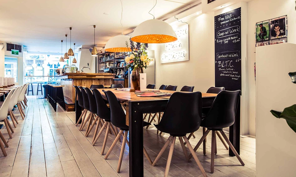 Teds is een gezellige zaak in hartje Amsterdam waar je de hele dag kunt genieten van ontbijt, brunch, lunch, drankjes en hapjes. Grote lampen, leuke quotes op de muur en een combinatie van zachte kleuren; wanneer je binnenloopt voel je je meteen thuis.